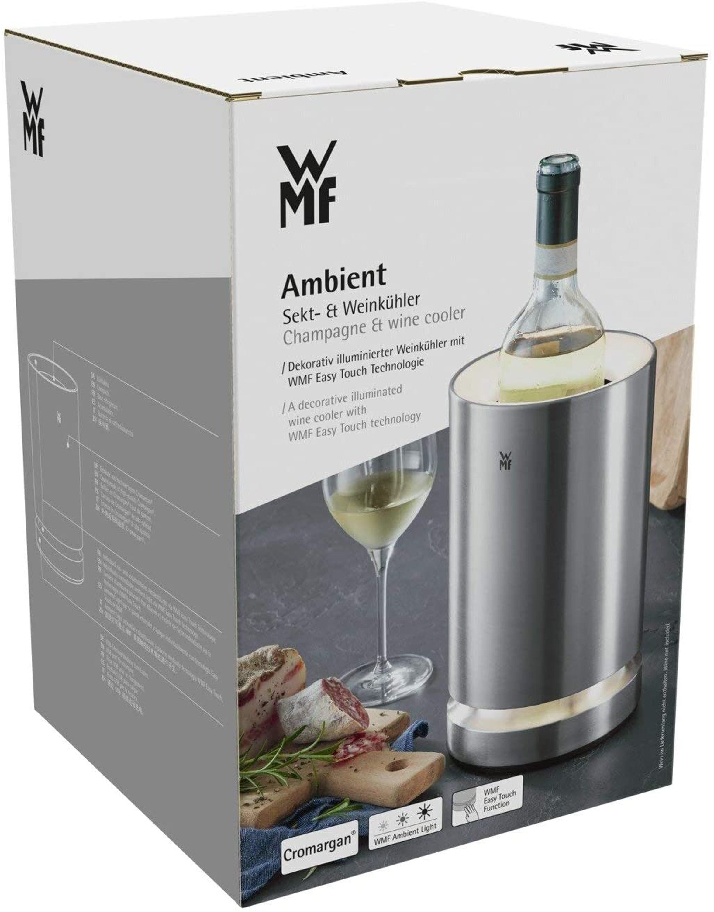 For a shiny appearance and effective decoration. Illuminated cooler for wine and champagne bottles up to 92 mm in diameter. Two light rings on the top and bottom of the refrigerator provide atmospheric lighting, which is controlled by simply touching the Cromargan® housing (WMF Easy Touch technology). You can set three different lighting levels. The flexible, unbreakable cooler can be stored in the freezer to save space.