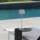 Cordless, rechargeable, battery table lamp. A touch control on the top of the lamp head allows you to switch the light on, adjust its intensity and select its color temperature.The lamp is equipped with a dimmer setting memory function that memorizes the dimming steps, so that every time it is switched on, the light intensity will correspond to the level set previously. The lamp is suitable for both indoor and outdoor use (except for models with a metallic-leaf finish which are not recommended for continuous outdoor use).The lamp comes with a contact charging base. USB charger included.