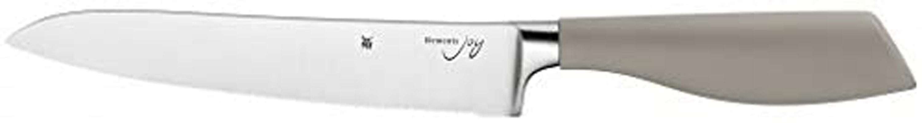 Barvito kuhanje in popolno prileganje rokam: set kuhinjskih nožev Joy podjetja WMF ponuja popolno zmogljivost rezanja, zasnovano tako, da zadovolji vse vaše potrebe po sekljanju, rezanju in rezanju na kocke – s posebnim ergonomskim formatom. Ta 4-delni komplet vključuje pametno inovacijo barvno označenih ročajev, tako da boste vedno vedeli, da sežete po pravem nožu, ne da bi ga morali potegniti iz bloka. Vsestranski kuharski nož dolžine 13 cm je opremljen z ročajem v beli barvi vanilije, medtem ko je 15-centimetrski nazobčani nož kamnito sive barve, 9,5-centimetrski nož pa se ponaša z osupljivim odtenkom slive rdeče. Pametno oblikovanje se ujema z zmogljivostjo kuhanja. Utrjena rezila zagotavljajo trajno ostrino, strokovno izdelana iz jekla s posebnim premazom, ki vzdrži preizkus časa. Ta vrhunska garnitura nožev ponuja izjemno ravnotežje, udobje, vzdržljivost – za brezkompromisno delovanje po standardih kakovosti WMF.