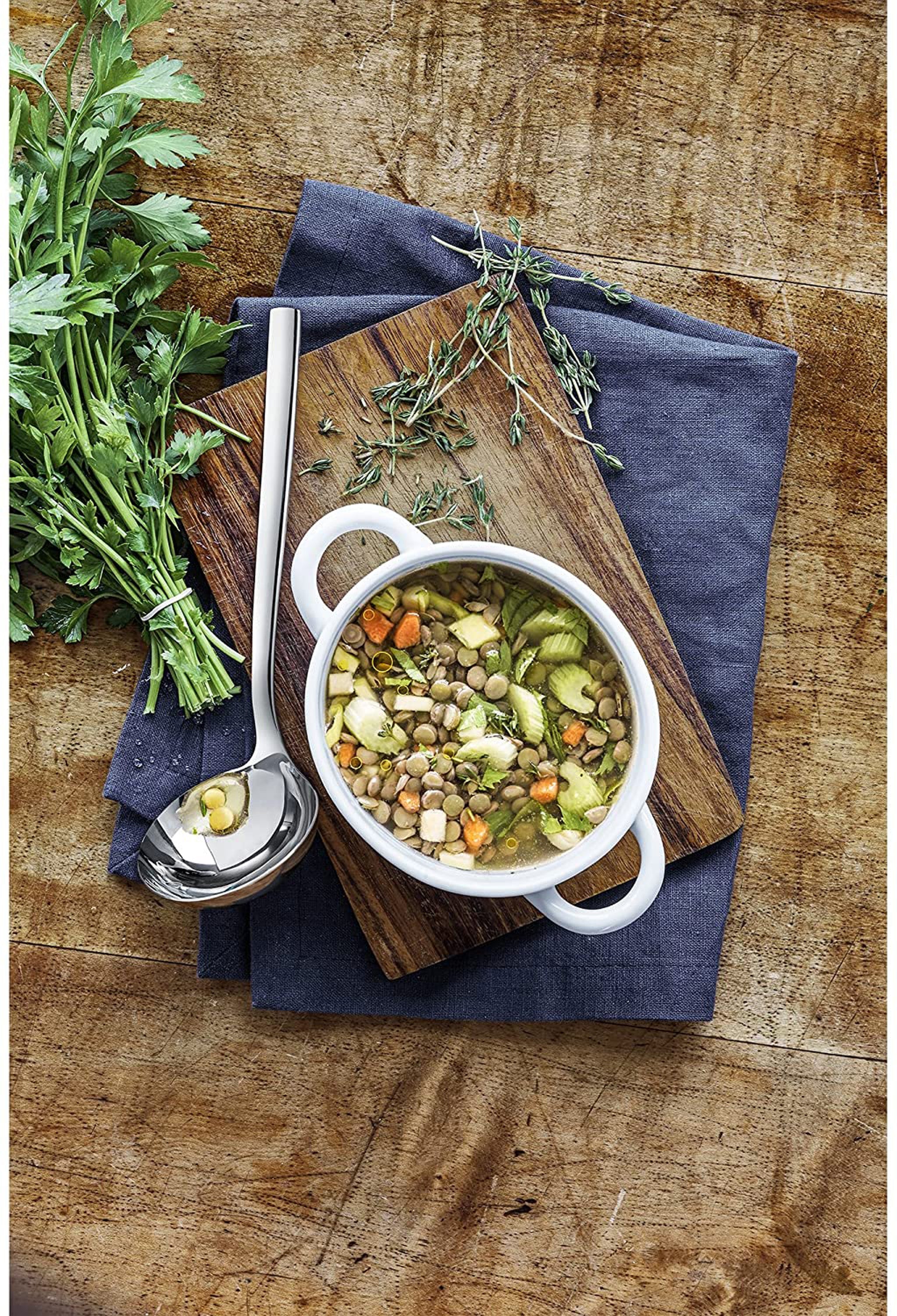 Odkrijte popolno rešitev jedilnega pribora za vsako priložnost. S kolekcijo Nuova podjetja WMF brezčasna, a funkcionalna paleta raznolikega jedilnega pribora – ki obsega skoraj 50 specializiranih kosov, od namiznega pribora do servirnih pripomočkov – vsak trenutek naredi pravo doživetje obedovanja. Ta osupljiva žlica za serviranje izdelana iz visokokakovostnega Cromargan®: nerjavečega jekla 18/10, za izjemno vzdržljivost z izvrstno estetiko, ki naredi vtis. Ta posebni pribor, izdelan z vsemi spretnostmi in znanjem, zaradi katerih je WMF postal znan, je primeren za pomivanje v pomivalnem stroju, enostaven za nego in odporen proti kislinam v hrani. Zajemalka je v visokokakovostni zloženi škatli z ilustracijo, pripravljeni za darilo.