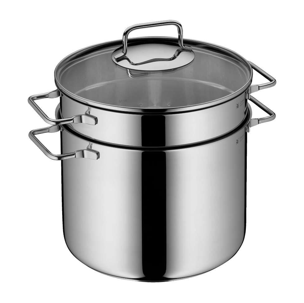 Kuhalnik za testenine WMF je kot nalašč za kuhanje vseh vrst makaronov in testenin – še posebej dolgih vrst, kot so špageti in linguine – brez lomljenja. Odstranjevanje testenin je prav tako enostavno, zahvaljujoč vgrajenemu cedilu, ki služi tudi kot priročna možnost shranjevanja, da se testenine pred serviranjem segrejejo. Lonec, izdelan iz elegantnega Cromargan®: nerjavečega jekla 18/10, ima ročaje za zmanjšano toploto, eleganten steklen pokrov za enostavno spremljanje med kuhanjem in širok rob za polivanje brez kapljanja in čisto kuhinjo. Kuhalnik za testenine, opremljen z univerzalnim podstavkom TransTherm® za optimalne rezultate kuhanja, je združljiv z vsemi štedilniki, vključno z indukcijskimi.