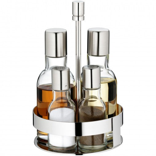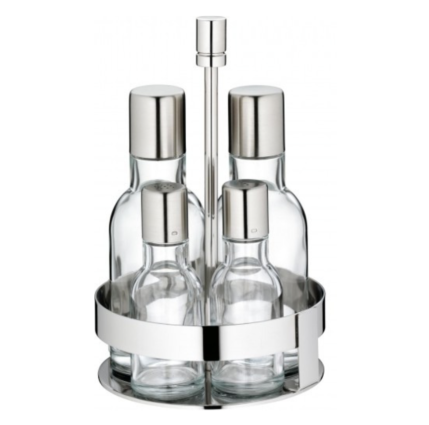 Items included: Stand, 2 oil/vinegar bottles, salt shaker, pepper shaker