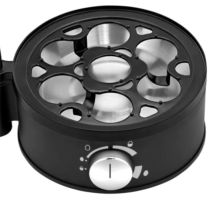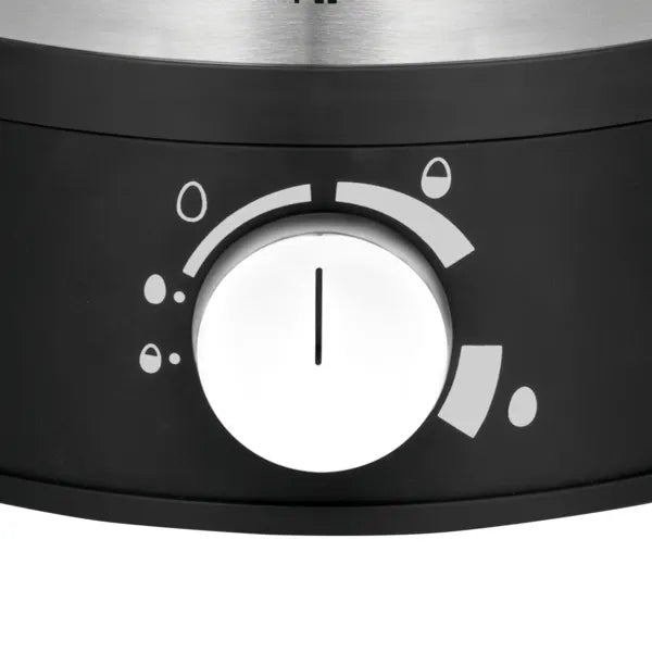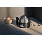 The STELIO Egg Cooker by WMF offers 7 delicious eggs boiled to perfection every time, with a cover in chic brushed Cromargan® stainless steel and enhanced features. Advanced electronics regulate the cooking time and let you cook up 7 eggs simultaneously with total precision, ensuring perfect results whether hard-boiled, medium or soft-boiled. Enhanced features like the separate on/off switch, an audible signal at the end of the cooking cycle and the convenient cord winder offer an indispensable addition to any kitchen. The STELIO Collection by WMF brings together silky, shimmering matte surfaces in exquisite Cromargan® stainless steel with sleek black accents, offering an elegant aesthetic that blends seamlessly with any kitchen. Discover the full breakfast series, including a drip coffee maker, coffee grinder, and kettle, along with matching blender and lemon squeezer.