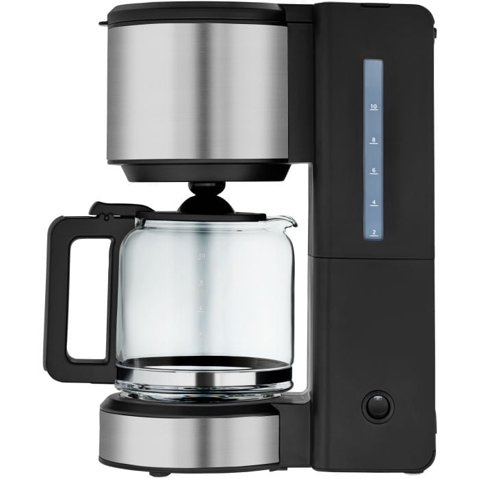 The perfect mix of style, durability and aroma: The WMF Stelio drip coffee maker offers a simple yet elegant design in high-quality, stylish matte Cromargan®: stainless steel 18/10, with a high-quality glass jug ensuring pure coffee flavor and aroma day after day. The smart design is comfortable and easy to use, with an external water-level indicator and a removable filter insert for an effortless coffee-making process. The glass aroma jug offers up to ten cups of hot and delicious coffee, maintaining full flavor and aroma for the unmatched delight of starting the day with the perfect cup. The drip-stop system lets you pour the first cup while the brewing cycle is still underway, while the auto shut-off feature offers total peace of mind. Advanced features are matched by durability, with a premium-quality Cromargan®: stainless steel 18/10 housing for long-lasting performance with a sleek matte aesthetic.