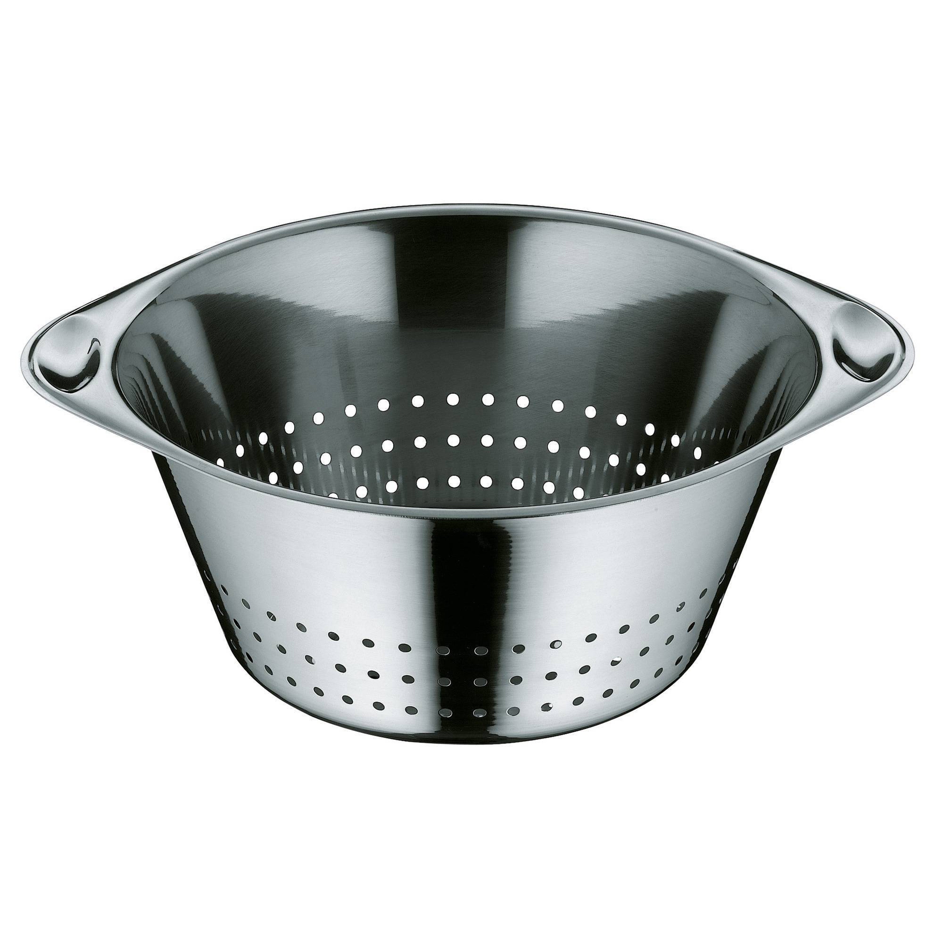 The perfect colander for total versatility: The WMF Broth Colander offers an essential kitchen tool at WMF standards of quality and design. Fine wire mesh ensures exceptional results for all your sieving, straining, rinsing and blanching needs, covering a wide variety of ingredients and recipes: sauces, pasta, rice, quinoa, jam, tea and more, as well as perfect sifting of flour and easy rinsing of fruits and vegetables. With a wide edge and perfectly positioned side handle, the strainer can be effortlessly positioned over bowls and pots for total convenience and comfort. The sturdy handle offers a secure grip that keeps fingers a safe distance from hot ingredients. Open handles offer space-saving hanging storage options, while the dishwasher-safe format is ideal for frequent use. Expertly crafted from WMF's own extra-durable Cromargan®: stainless steel 18/10—flavor neutral, acid-resistant, easy to care for and extremely hard-wearing—for quality that's built to last.