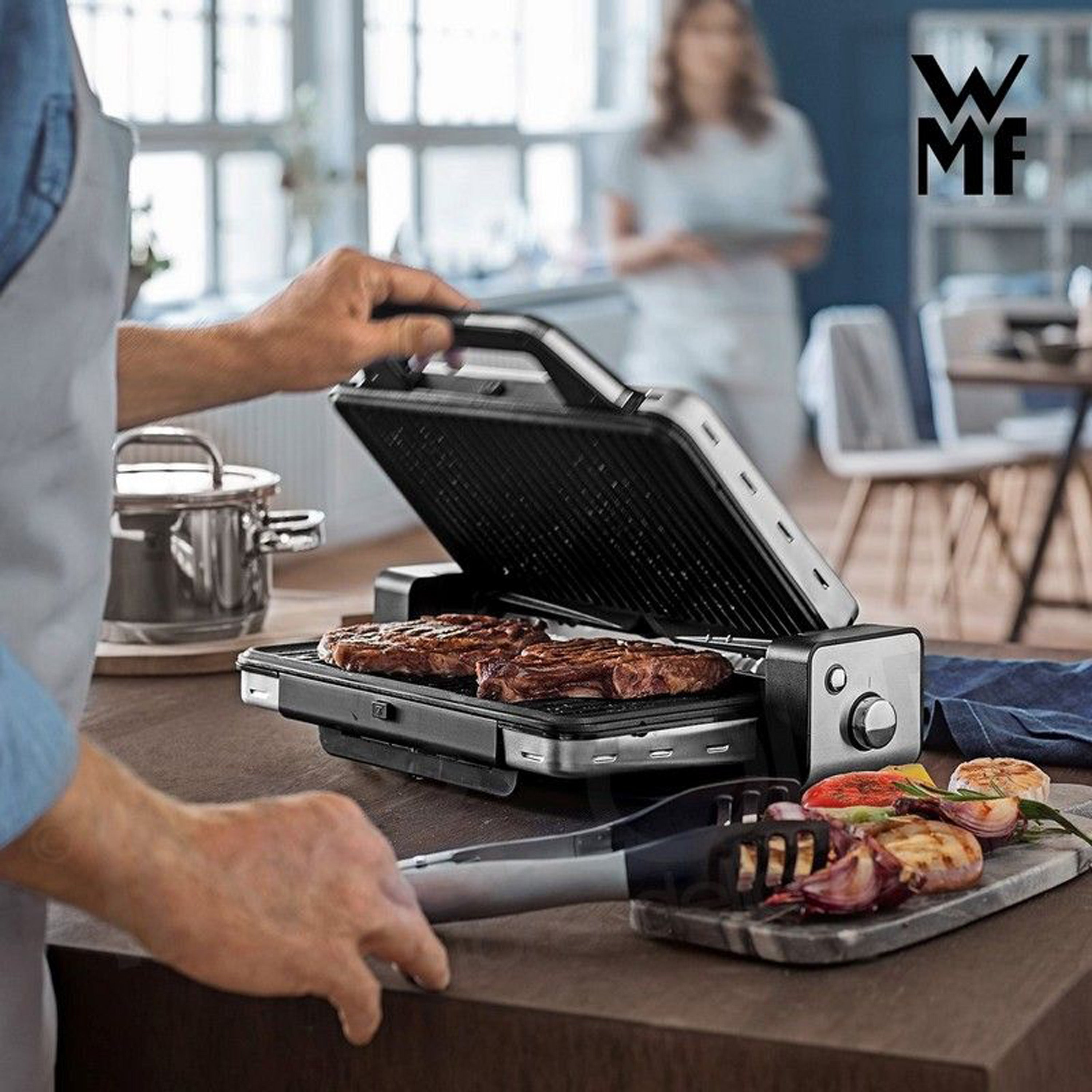 The WMF Lono Grill 2in1 can be used as a contact grill, when you open it, it can also be a table grill. 2100 watts of power ensures fast heating and high temperatures. You can set the right baking temperature with the rotary knob. The Vario-Flex grill plate is unique. The intelligent Vario-Flex grill plate is adjustable according to the height of your fish, meat or vegetables. The tender meat is not pressed, but there is still enough pressure for a delicious grill pattern. This means it can also be used as a sandwich or panini grill. Thanks to the adjustable suspension, the plate is always optimally positioned even when preparing food on the grill at different heights. The two cast aluminum plates are coated with a non-stick coating, so you don't need to add extra fat to bake your treats. Excess cooking fat flows through the grooves into the fat collection tray. For low fat and healthy barbecue fun! Like the housing, the grease tray is made of high quality Cromargan stainless steel. This one is particularly durable and easy to clean.