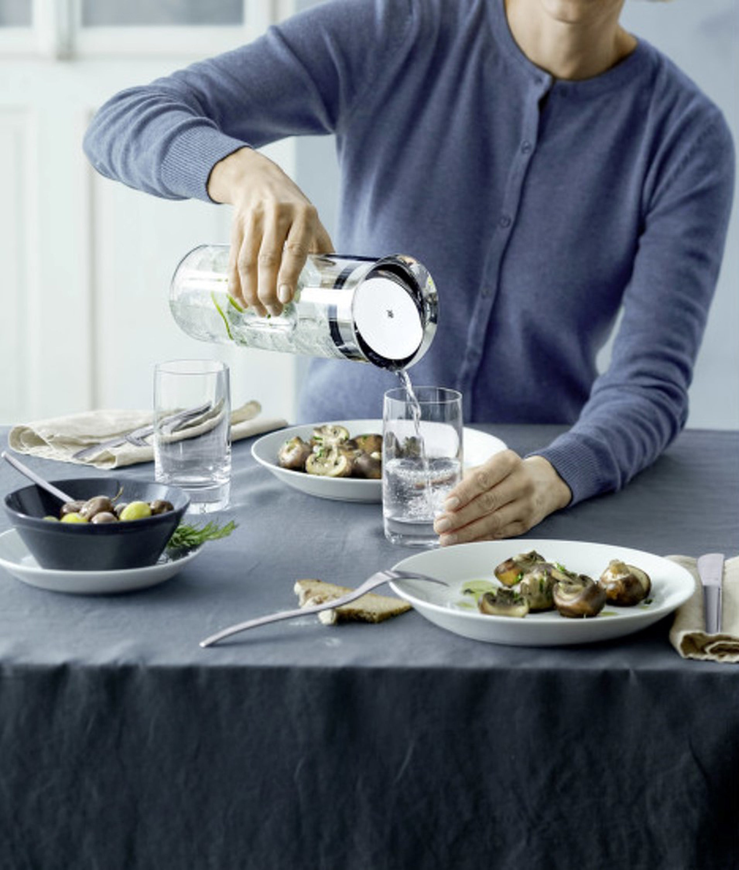 Whether at home or on the go - the water carafes from the Motion collection make drinking as easy and practical as necessary and at the same time as attractive as possible. This means the highest level of comfort meets the most wonderful drinking pleasure. Handy and ergonomically shaped in a modern, elegant design, the water carafes are the perfect eye-catcher - every day, for every occasion and on every table. The high-quality material mix of heat-resistant WMF glass, silicone and Cromargan® make the carafe an absolutely popular water dispenser.