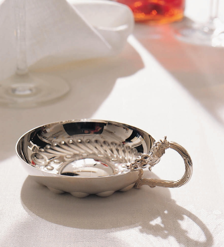 The sterling silver Taste Vin by Robbe & Berking is a wonderful gift for any wine lover. Sommeliers often wear one on a leather strap around their neck.With its asymmetrical relief decoration and reflective silver surface, wine tasters can judge the colour of the wine in different lights. Many Robbe & Berking aficionados also use it as a small bowl to hold odds and ends.