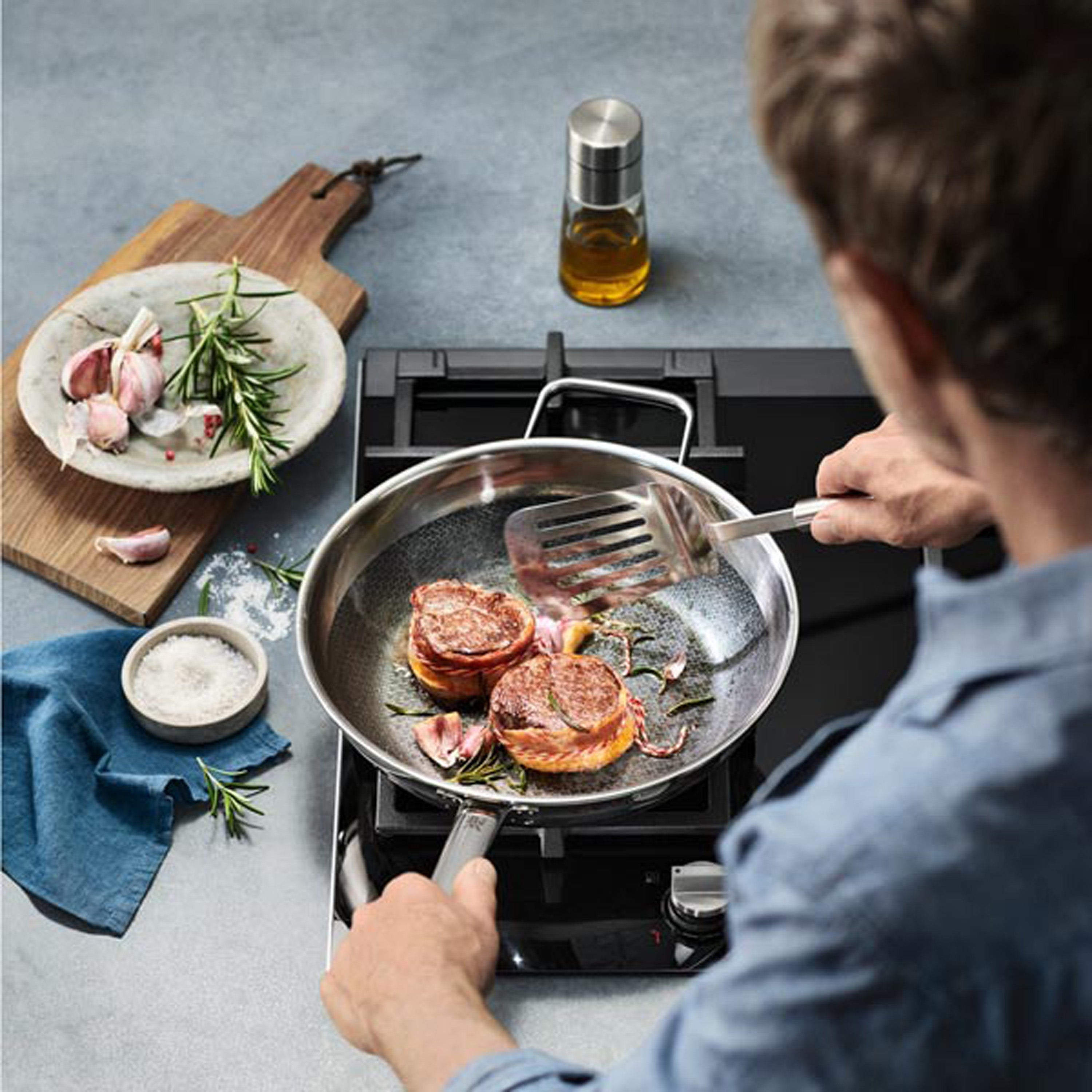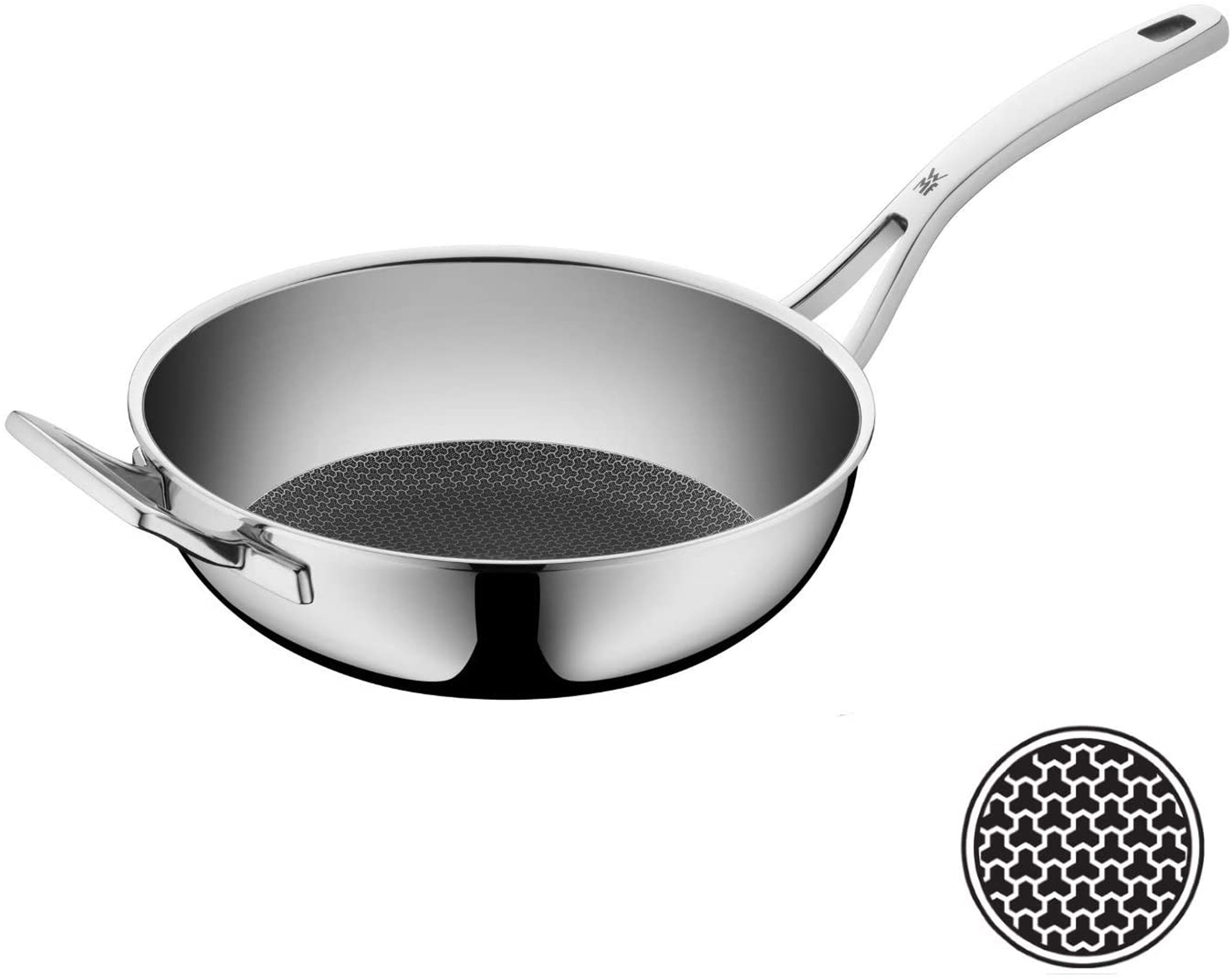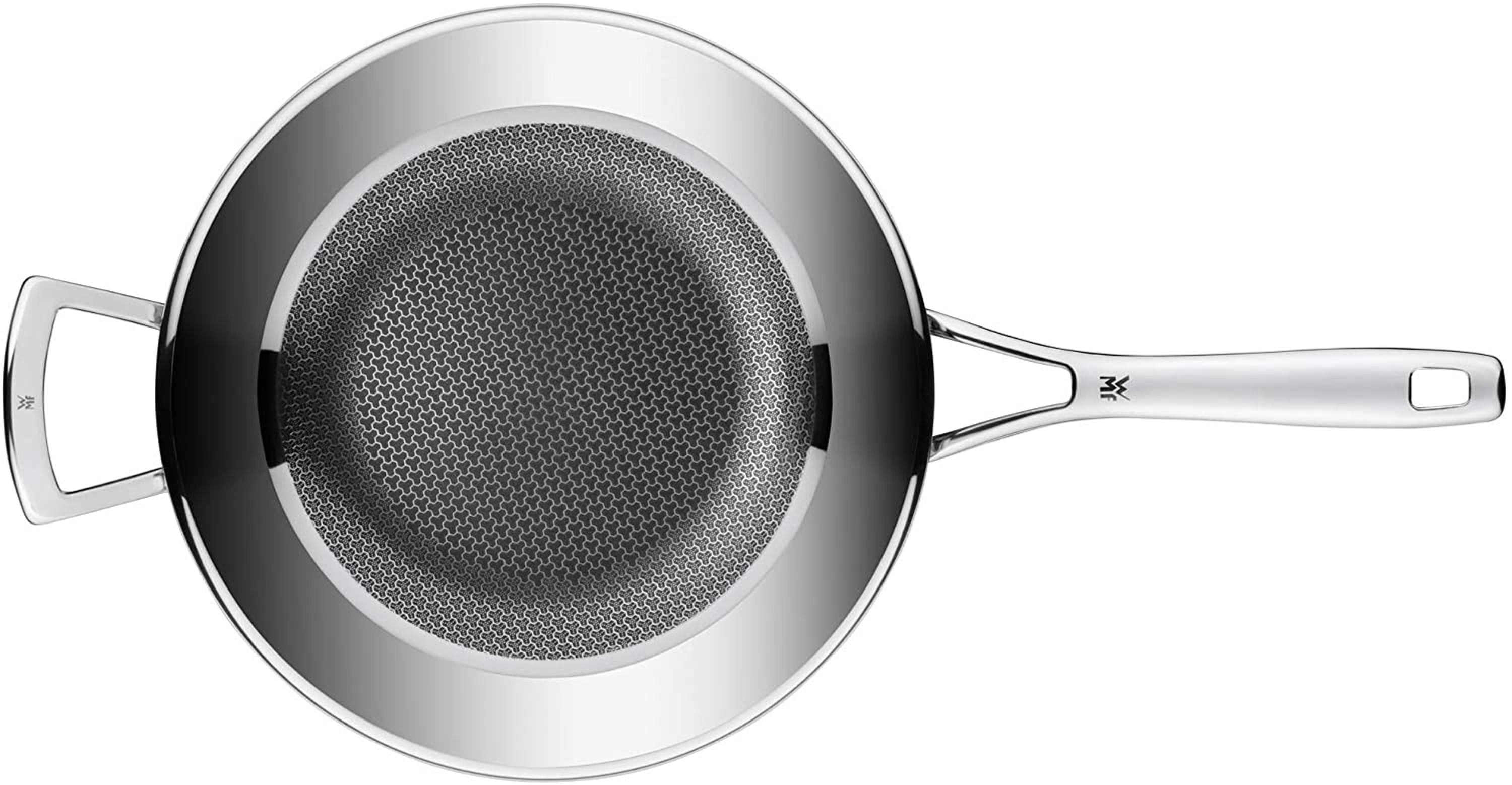 From Asian stir-frying at very high temperatures to cooking delicate ingredients with minimum added oil, the WMF Profi Resist Wok Pan brings together the best of two worlds. On the one hand, its scratch-resistant WMF Protection Grid and PermaDur Long-Lasting non-stick coating offer robust use and effortless clean-up. On the other hand, a multilayer construction with aluminum core and Cromargan® exterior ensures the outstanding results of a traditional uncoated pan. With a design that safely goes from stovetop to oven in an instant, and convenient features including reduced-heat handles and a wide pouring rim, this wok pan promises flawless results every time. Compatible with all stovetops, including induction.