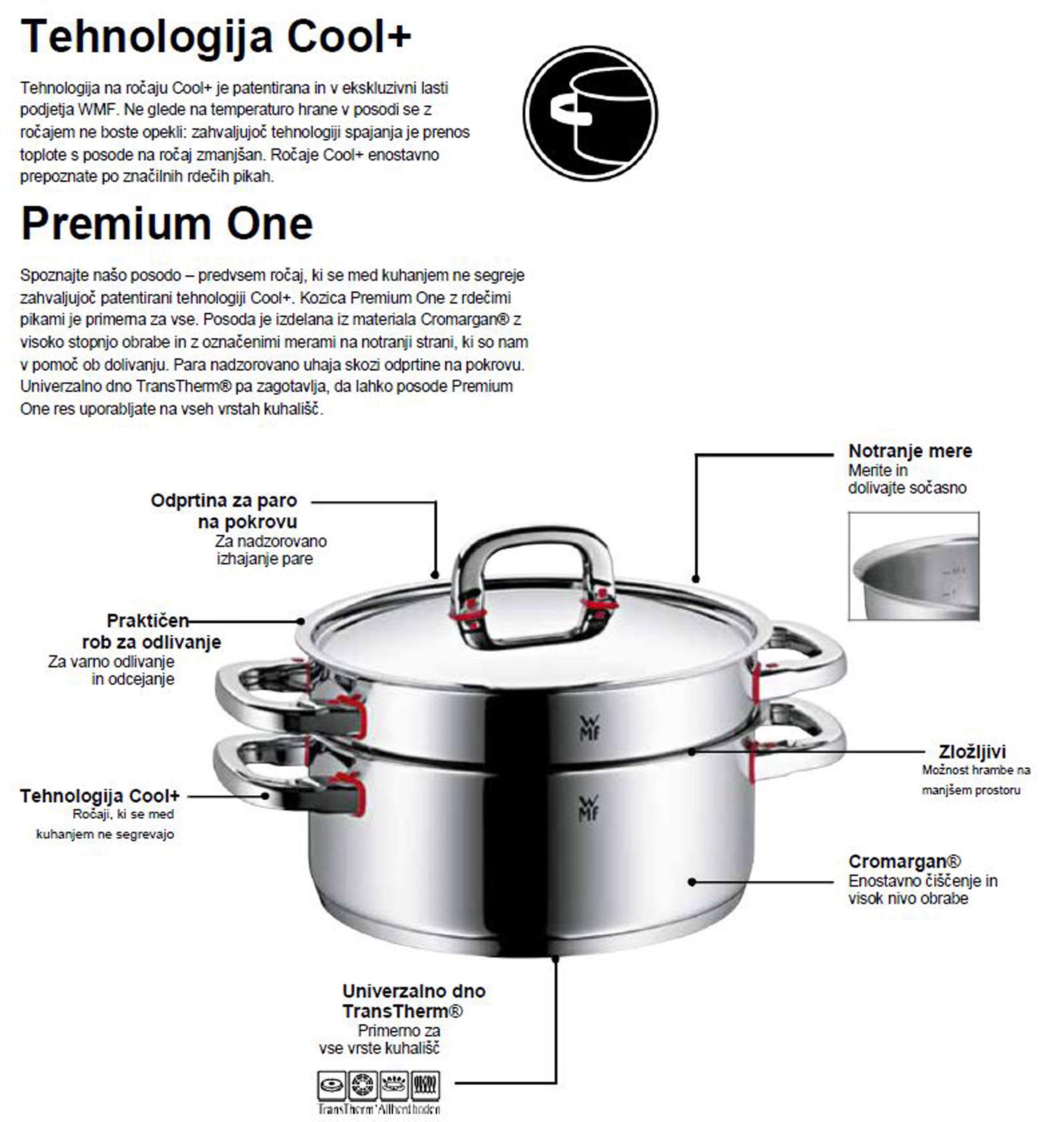 Spoznajte našo posodo, še posebej ročaj, ki se zaradi patentirane tehnologije Cool+ med kuhanjem ne segreva. Linija Premium One z rdečimi pikami je primerna za vse. Posoda je izdelana iz materiala Cromargan® z visoko stopnjo obrabe in označenimi merami na notranji strani, ki nam pomagajo pri polnjenju. Para kontrolirano uhaja skozi odprtine na pokrovu. Univerzalno dno TransTherm® zagotavlja, da lahko ponve Premium One uporabljate na vseh vrstah kuhalnih površin.