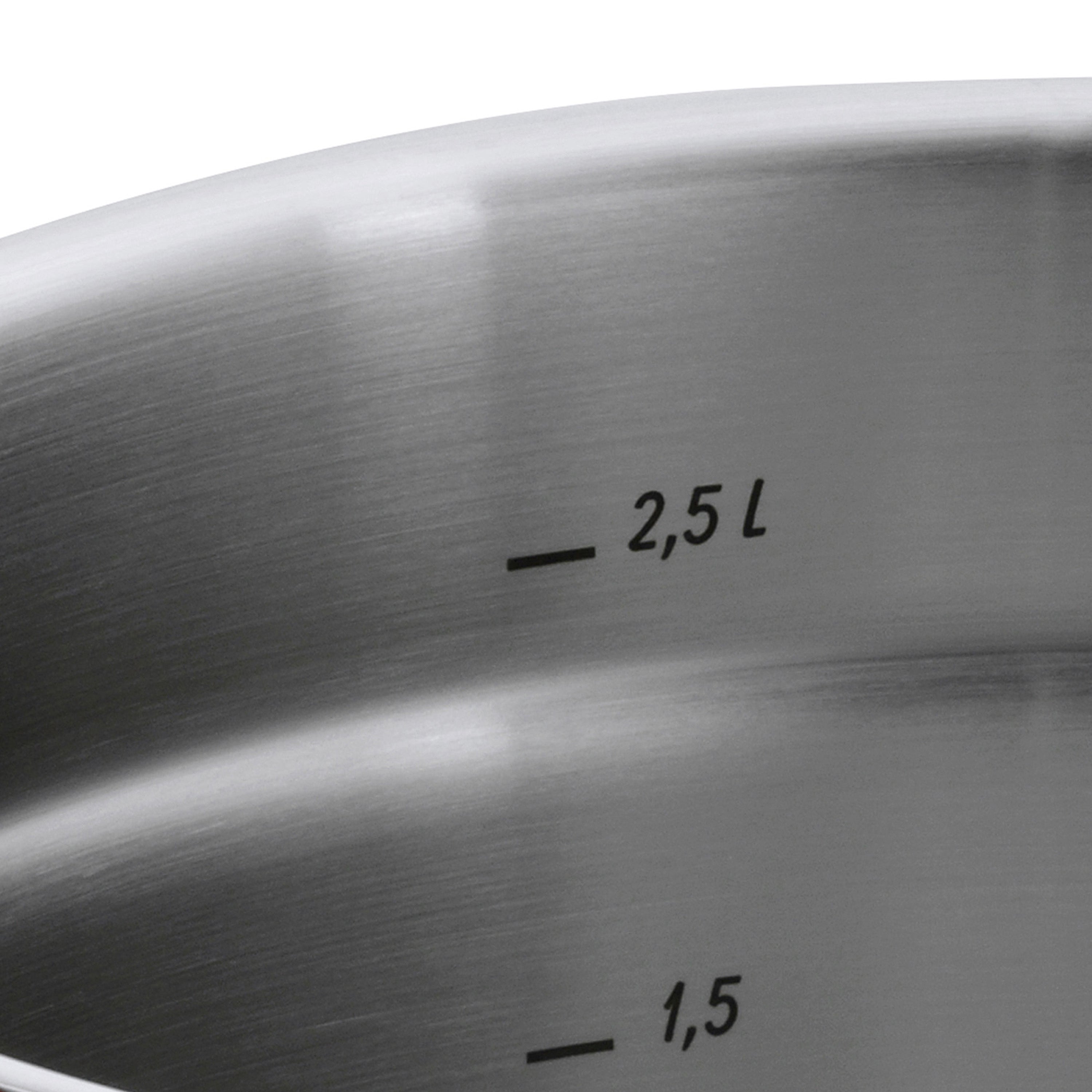 Get to know our cookware, especially the handle, which does not heat up during cooking thanks to the patented Cool+ technology. The Premium One line with red dots is suitable for everyone. The container is made of Cromargan® material with a high level of wear and marked measurements on the inside, which help us when refilling. Steam escapes in a controlled manner through openings on the lid. The TransTherm® universal bottom ensures that the Premium One pans can really be used on all types of cooking surfaces.