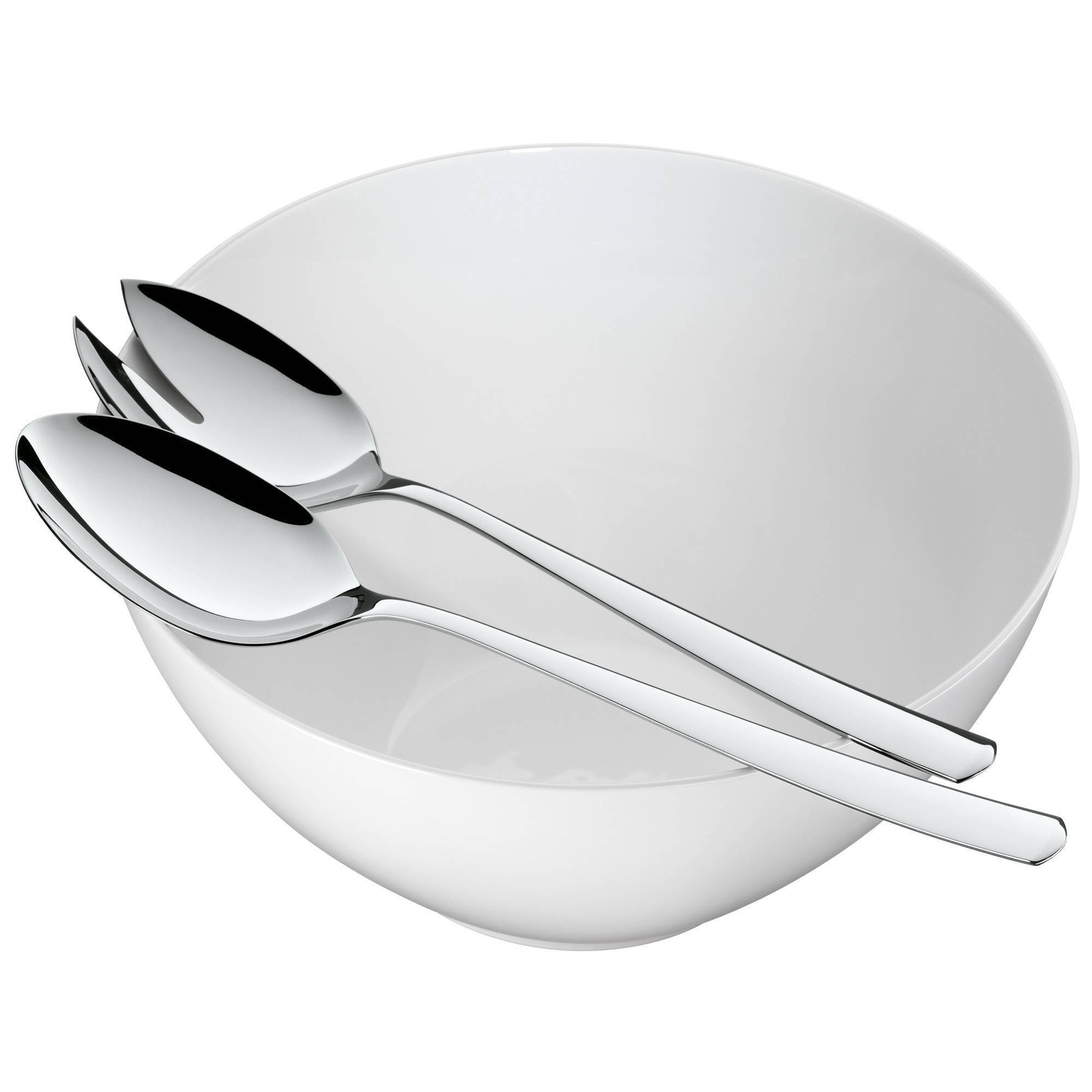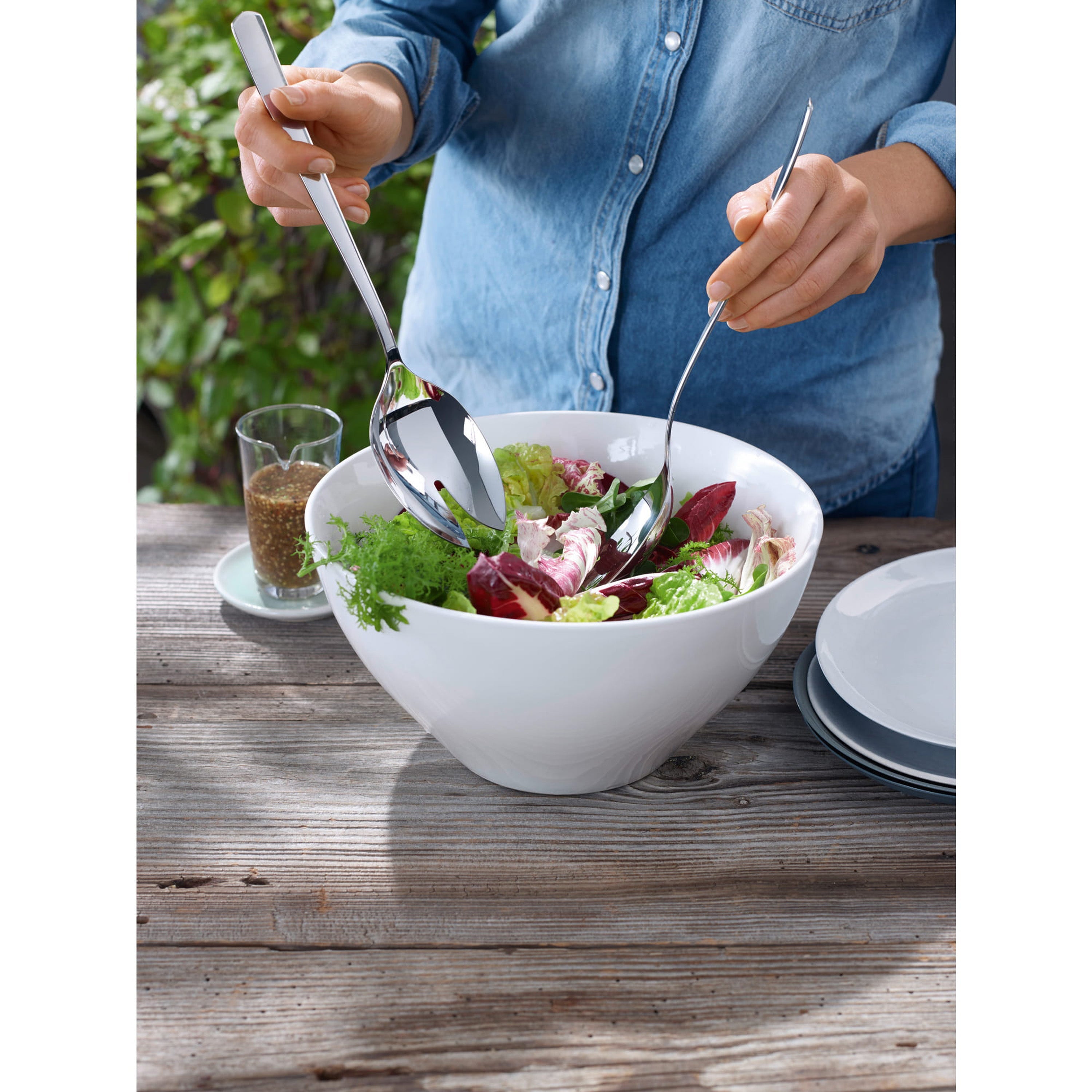 The perfect finishing touch for a sophisticated dining experience: The Salad Set Bistro represents WMF's art of the table at its finest, bringing together practical, comfortable and convenient functions with eye-catching style. This salad set includes an elegant porcelain salad bowl at pure style and a pair of salad servers crafted from high-quality Cromargan®: stainless steel 18/10—flavor-neutral, acid-resistant and extremely hard-wearing for exceptional durability with an elegant polished finish that never fails to impress. All parts of the set are dishwasher-safe, easy to care for and long-lasting. It comes in a high-quality, gift-ready folded box with illustration. WMF: The art of the table, with strong tradition for over 160 years.