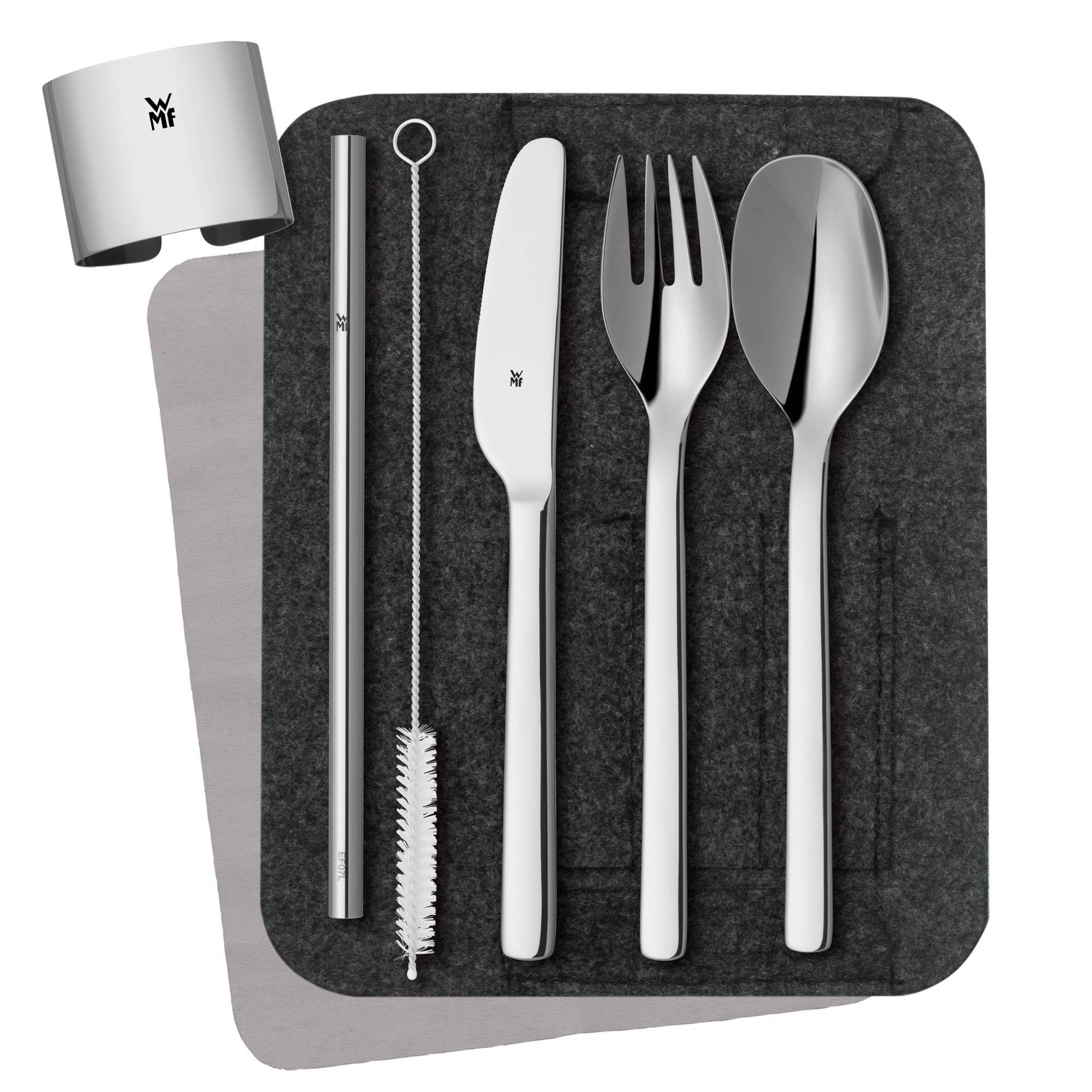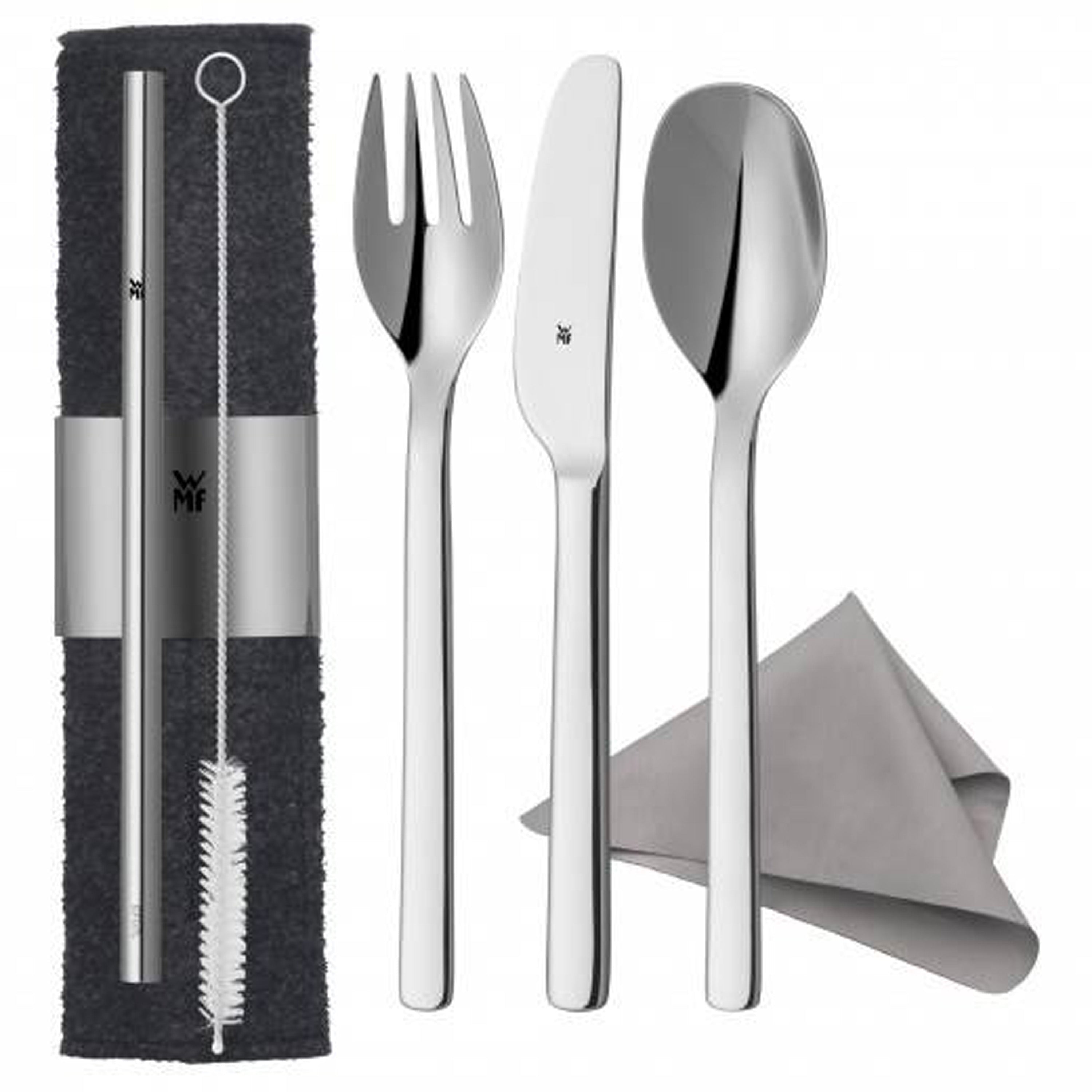 With the stylishly modern My2Go cutlery set with reusable straw, make sustainability a part of every meal—wherever life takes you. From breakfasts at your desk to take-away lunches and on-the-go drinks, every piece is specially developed with well-designed proportions for on-the-go use and optimal handling. Crafted from stunning Cromargan®: stainless steel 18/10, this set includes a fork with a "spork"-like shape, a rounded knife for easy cutting and spreading, a small but deep spoon to better reach the bottom of cups, and a drinking straw with cleaning brush for delicious drinks and juices to go. The perfect answer to disposal tableware, this long-lasting set can even be personalized and comes in a convenient roll-away case made from 100% recycled materials, for easy yet stylish transport. The cutlery and straw are also rustproof and dishwasher-safe, ensuing excellent hygiene and effortless clean-up day after day.