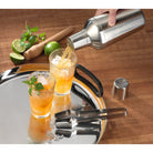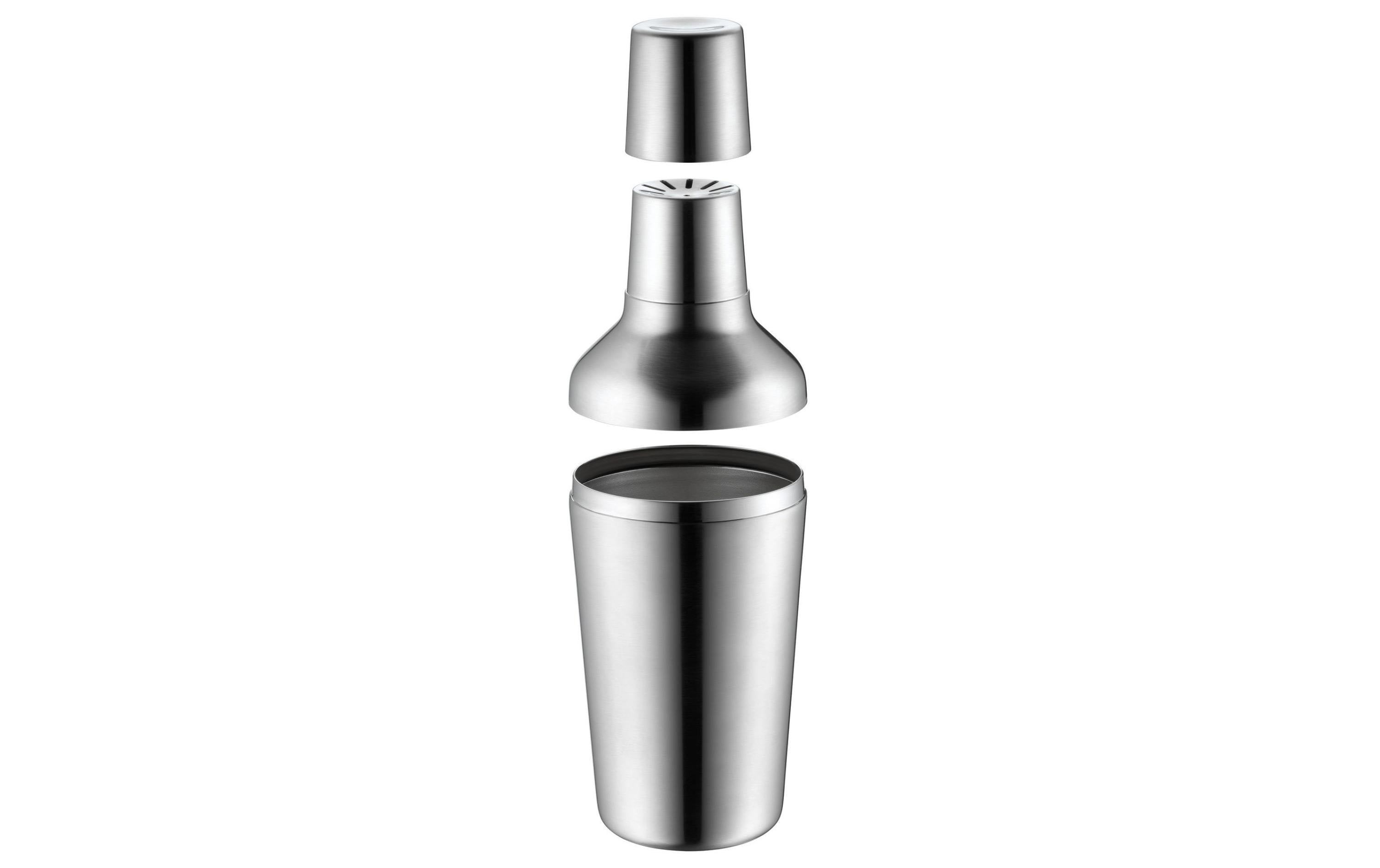 Od Gin Fizz-a do Moscov Mule ali klasičnega Mojita, ta koktajl barski set v hipu postreže popolne koktajle – in vsak od dodatkov se lahko pospravi v stresalnik za pametno shranjevanje, ki prihrani prostor, ko ni v uporabi. Izjemen komplet vključuje stresalnik z vgrajenim cedilom za zadrževanje ledu in sadja, pokrovček, ki služi tudi kot merilna skodelica, nazobčane klešče za led in leseno tolkalo. S svojo elegantno, prefinjeno estetiko je vsak kovinski kos izdelan iz Cromargan®: nerjavečega jekla 18/10, ki zagotavlja izjemno vzdržljivost in higieno, ki je obstojen na barvah, varen za pomivanje v pomivalnem stroju, nevtralnega okusa in odporen na kislino.
