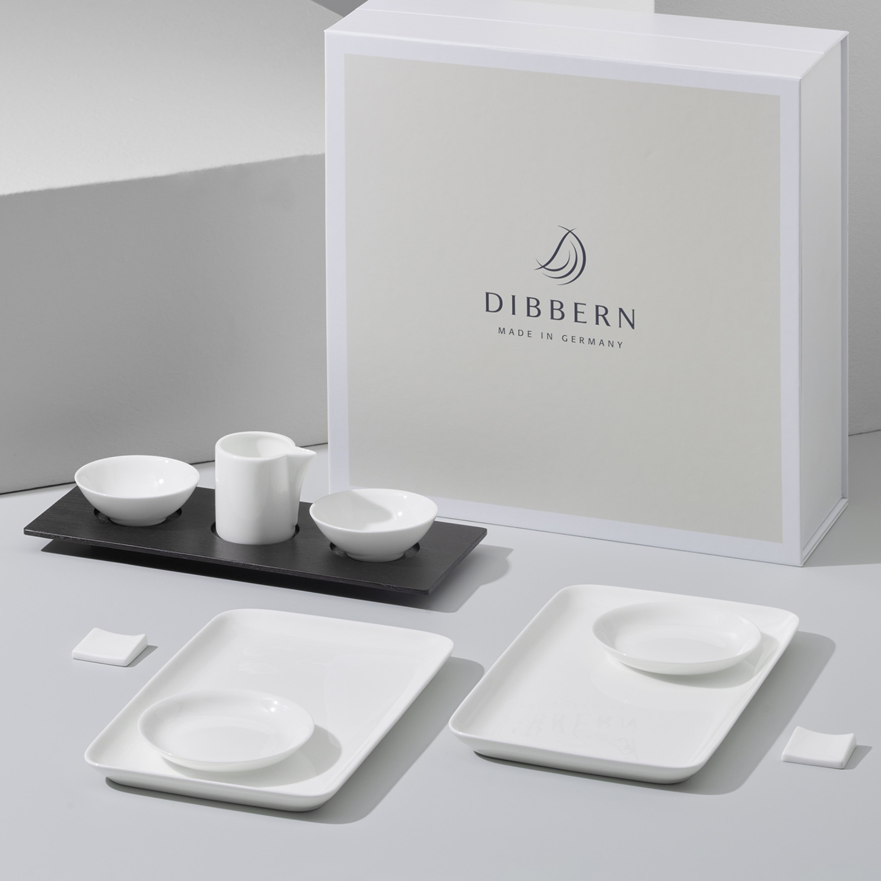 New SUSHI SET made of Dibbern Fine Bone China and top-quality wood is the ideal setting to turn sushi into an event at home. The clear lines, the delicate appearance and the special fineness of the porcelain correspond to the philosophy of an extraordinary meal that lets you travel to another world with color, shape and flavors. Fine Bone China: dishwasher-and microwave safe - Wooden tray: suitble for food, not dishwasher safe. Containing 2 x rectangular dish 15 x 25 cm, 2 x dip bowl round 8 m, 2 x dip bowl flat 10 cm, 2 x chop sticks rest, 1 x creamer cylindrical, 1 wooden tray.