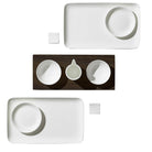 Set vsebuje 2 x pravokotno posodo 15 x 25 cm, 2 x okroglo posodo za namakanje 8 m, 2 x ploščato posodo za namakanje 10 cm, 2 x podstavek za palčke, 1 x valjasto posodo za smetano, 1 lesen pladenj.