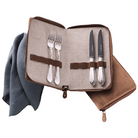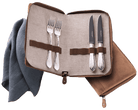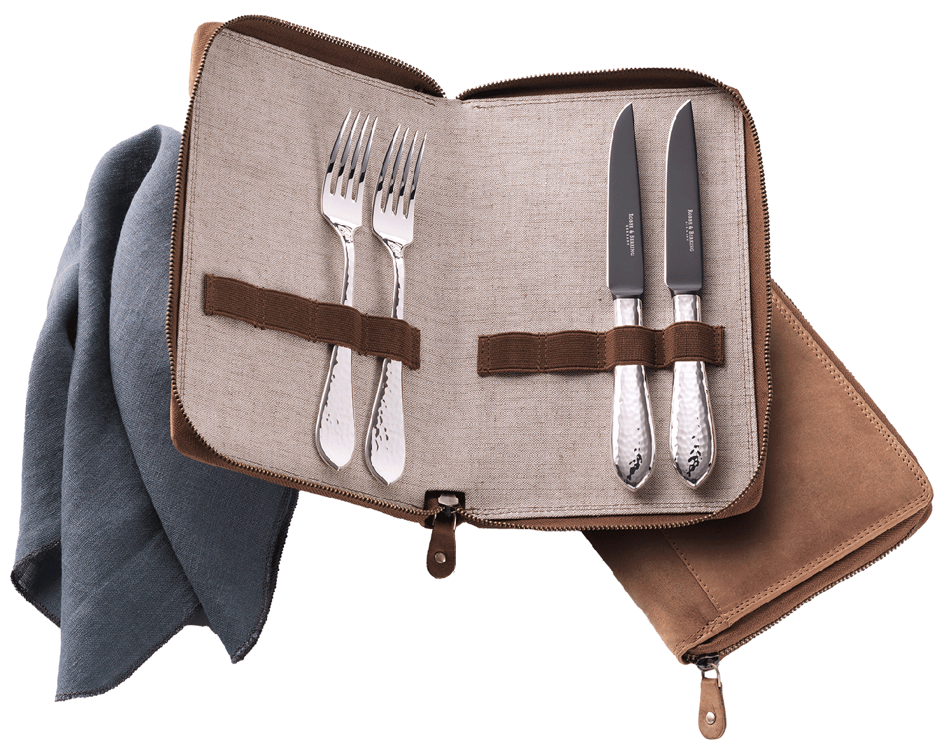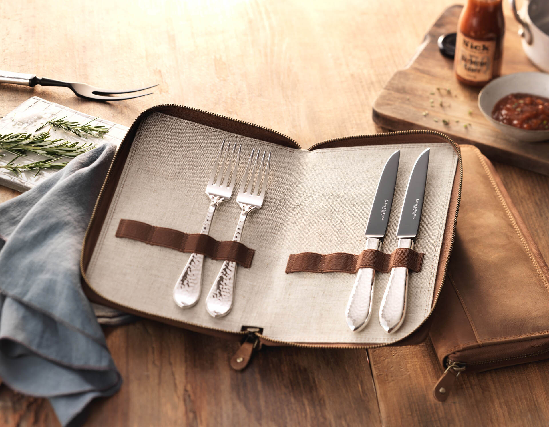 Set je sestavljen iz: 2x Steak Knife Frozen Black, 2x Menu Fork, 2x Linen prtiček, 1x Usnjena torbica